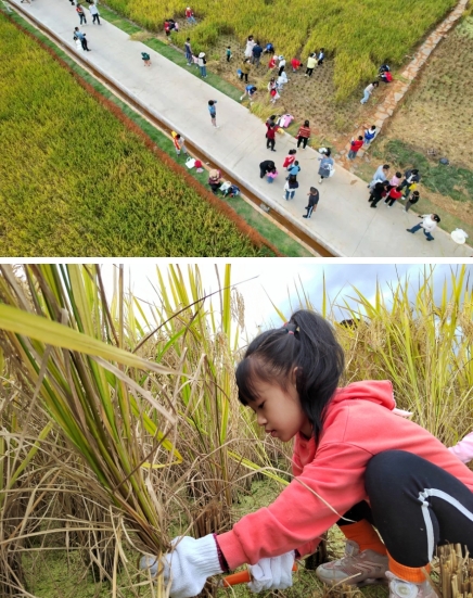11月12日,市政集團建設(shè)的龍州濕地水稻田迎來了豐收季,藍天白云倒影在清澈見底的湖面,伴隨著五彩繽紛的波斯菊花海搖曳生姿,金黃色的稻谷在秋風中散發(fā)著陣陣稻香...城市的繁華與美不勝收的風景和諧共生的畫面,吸引了來自龍巖中心城區(qū)中小學生、家長及眾多市民前來參觀、體驗。學生們利用假期走進田間課堂,真切體會了龍巖“新晉網(wǎng)紅打卡地”的獨特魅力。